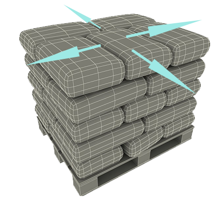 When cargo being on monving,sharply stoping or reducing the speed, quickly starting moving or speeding up,making a turn and bumping move etc... can cause the cargo unit scattering,inclining and being out of shape etc.... Which are the main reason to lead the cargo damage and even danger to the operator . The traditonal ways to fix the cargo are using the wrapping film,stretch film or shrink film,which still can not sovle the problem,most of the cargo one pallet will be out of shape and size expanding.After the pallet cargo moving in warehouse and size change,it's very difficult to load into the truck or container, when cargo arrived in customers, when discharge the cargo are easy to be damaged.